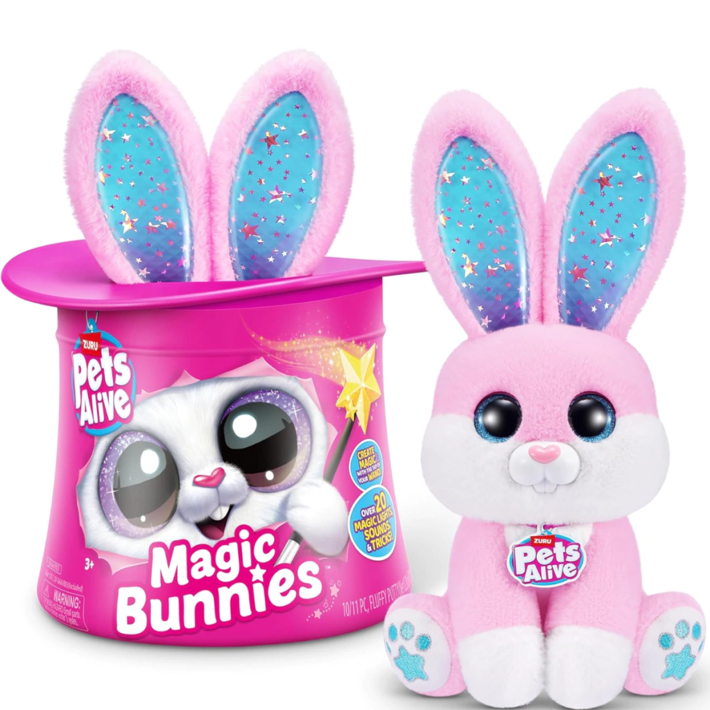 Abrí la puerta a un mundo de encantos con los adorables Magical Bunnies, unos conejitos interactivos que iluminan, hacen sonidos y esconden mini sorpresas mágicas. ¡La diversión comienza con tu varita de estrella!