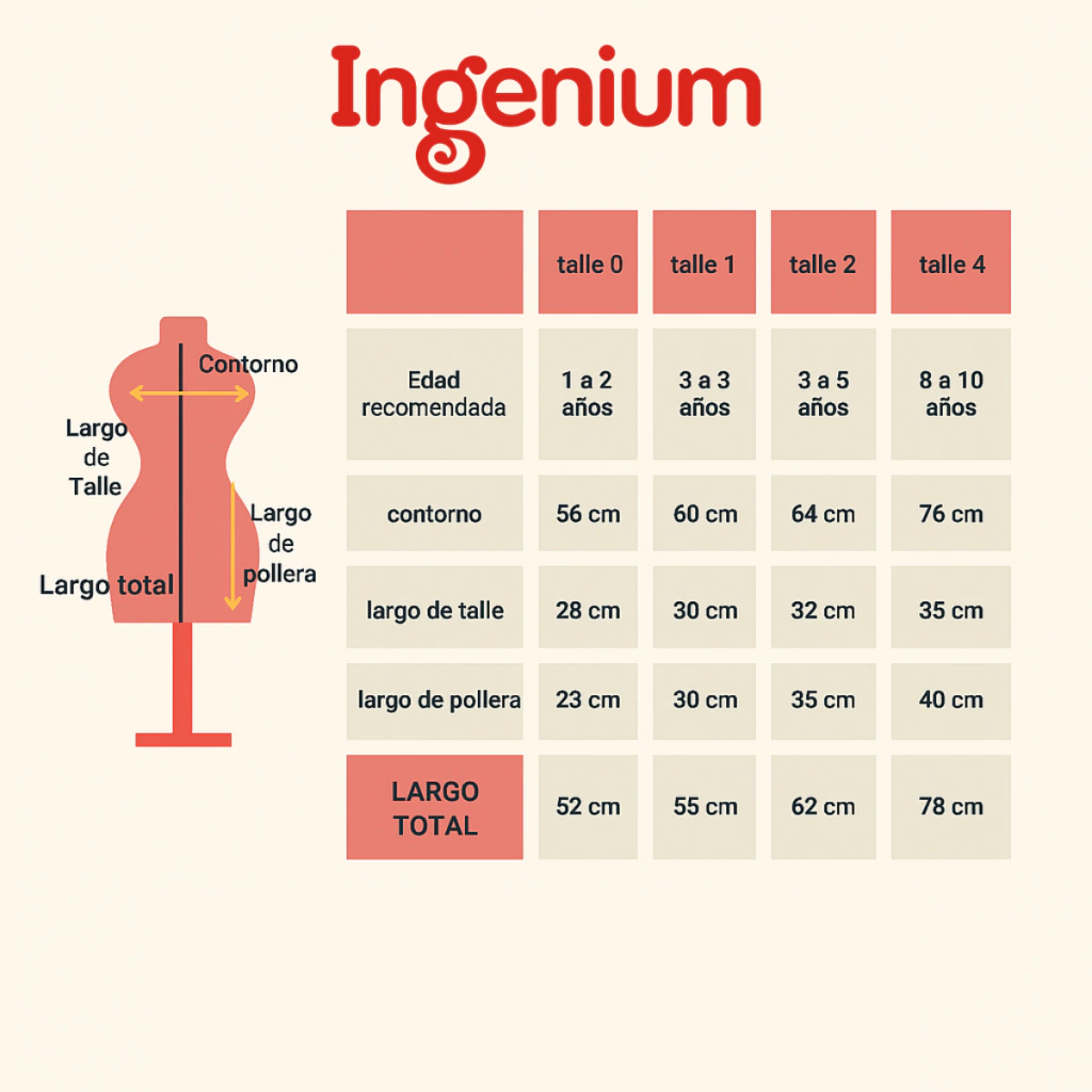 | Talle | Edad recomendada | Contorno | Largo de talle | Largo de pollera | Largo total |