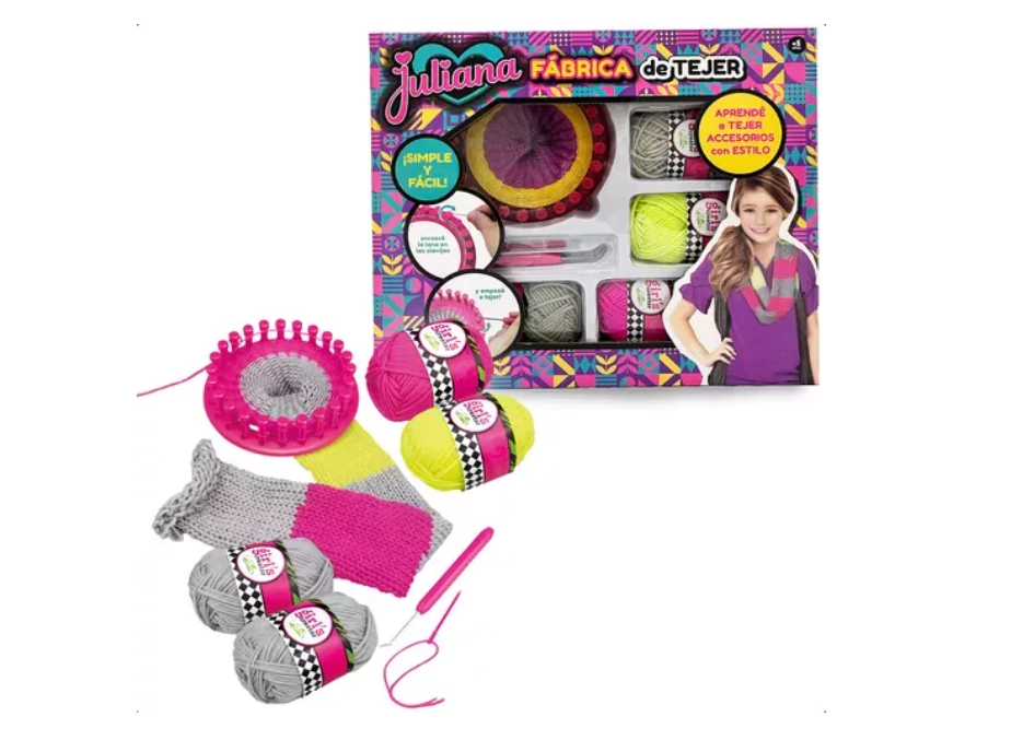 • Contiene: Telar circular, enhebrador, aguja, 4 ovillos de colores, manual de instrucciones