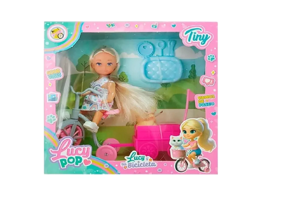La muñeca Tiny Lucy Pop con su bicicleta y accesorios es el regalo perfecto para niñas de 5 a 7 años. Con una altura de 12 cm, esta muñeca articulada es ideal para jugar y coleccionar. Fabricada en plástico de alta calidad, garantiza durabilidad y diversión para las pequeñas.