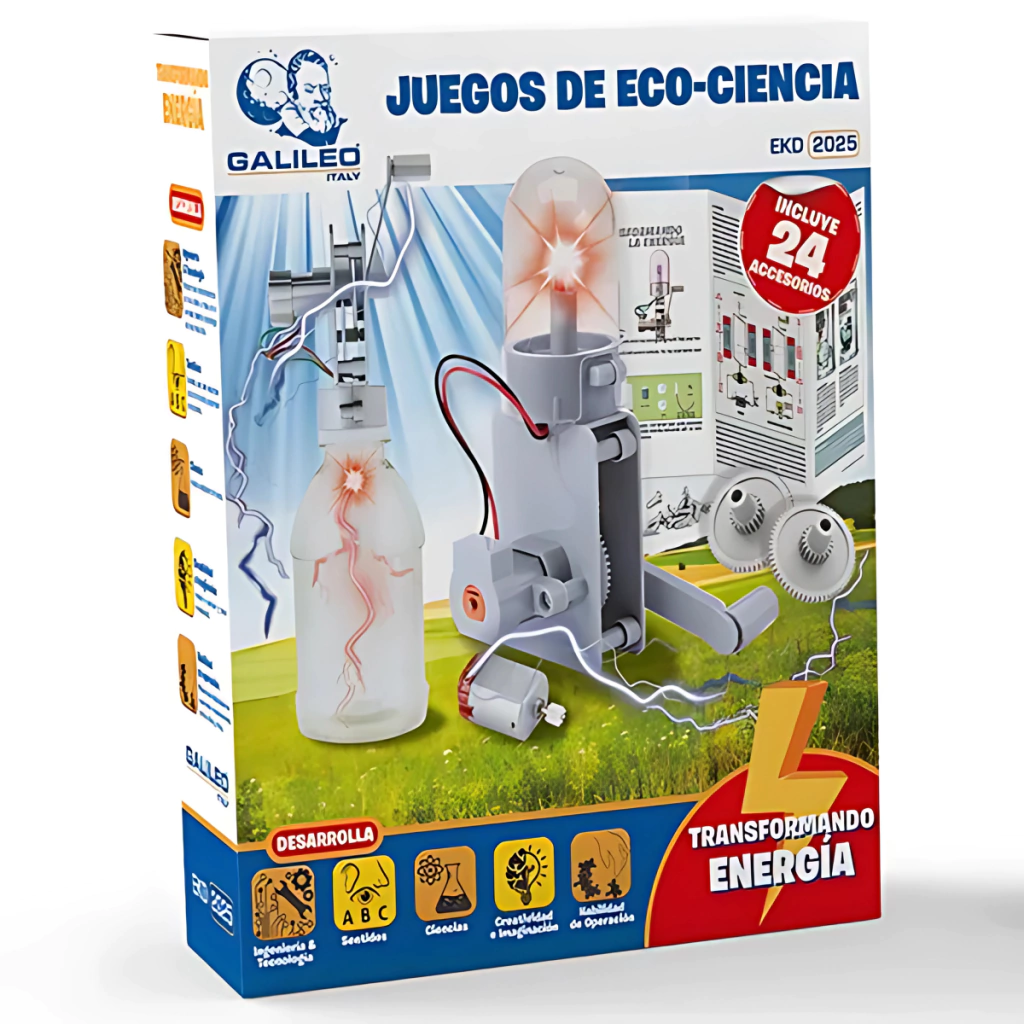¡Descubre el fascinante mundo de la energía renovable con el Juego de Eco-Ciencias - Transformando Energía! Este innovador kit convierte el juego en una experiencia educativa única, donde el movimiento de tu mano genera electricidad. Con un simple giro, podrás encender una bombilla sin necesidad de baterías ni contaminación, ¡solo con tu creatividad!